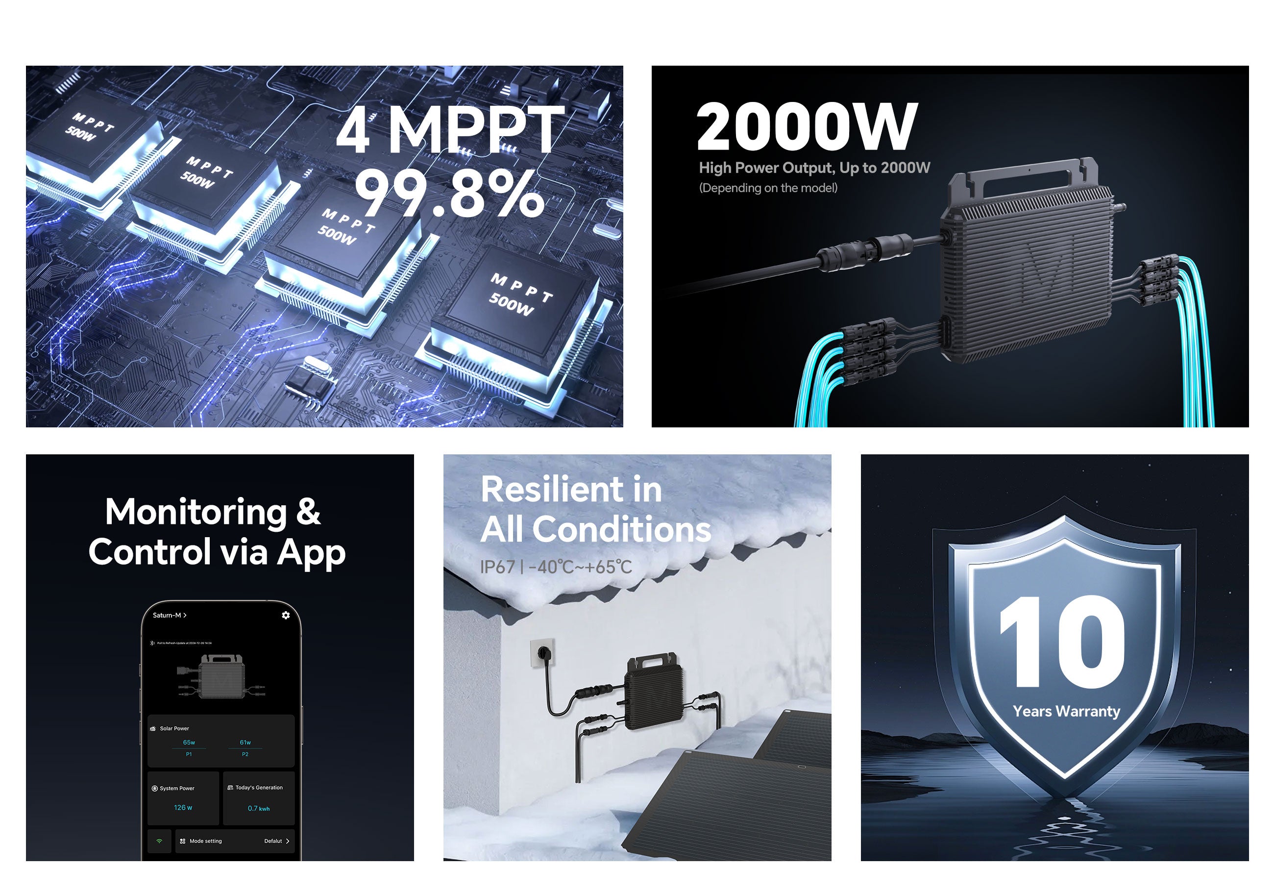 Mit einem Wirkungsgrad von bis zu 99,8 % passt der Marstek Saturn-M-Mikrowechselrichter seinen Betriebspunkt in Echtzeit an, um eine optimale Leistungsabgabe zu gewährleisten, selbst bei komplexen Lichtverhältnissen wie Abschattung oder Schmutz. Das System reagiert intelligent auf Änderungen der Lichtintensität, der Temperatur und des Wetters, minimiert die Energieverschwendung und bietet eine höhere Energieumwandlungseffizienz und -stabilität.